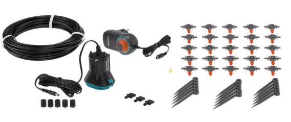 W zestawie znajduje się transformator z pokrętłem do ustawiania programów nawadniających, niskonapięciowa pompa 14 V z filtrem, 25 kroplowników rzędowych (2 l/godz.) z korkami zamykającymi i igłą czyszczącą, 10 m rury rozdzielczej 4,6 mm (3/16") oraz 15 szpilek utrzymujących rury.
